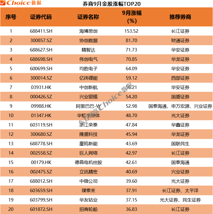 Choice数据统计了27家券商的9月金股组合,共涉及254只个股,其中150只个股在9月实现上涨,41只涨幅超20%,股市表现活跃。具体来看,长江证券推荐的海博思创月度涨幅高达153.52%,位居券商9月金股涨幅榜首位;财通证券推荐的协创数据、华安证券推荐的精智达分别以81.7%、71.73%的涨幅位居第二、第三;国泰海通、申万宏源、兴业证券推荐的阿里巴巴-W上涨52.98%。