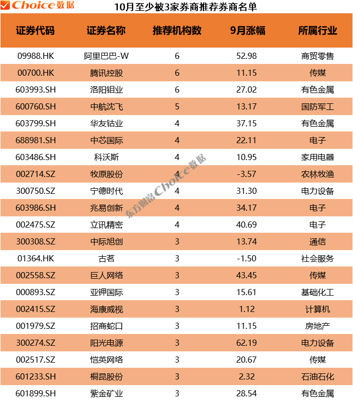 券商9月金股收益排名揭晓,10月金股名单及观点汇总