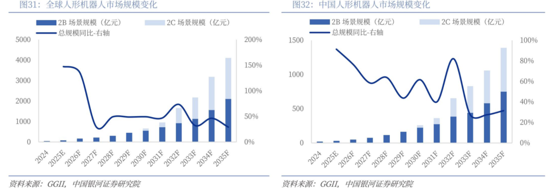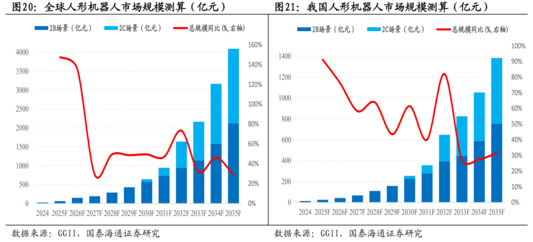 据 GGI 预测,2025 年全球人形机器人市场销量有望达到 1.24 万台,市场规模 63.39 亿元,到 2030 年全球人形机器人市场销量将接近 34万台,市场规模将超过640亿元。预计到 2031年,我国人形机器人进入快速起量期,到2035 年销量有望达到200万台左右,市场规模有望接近 1400 亿元,人形机器人潜力巨大。