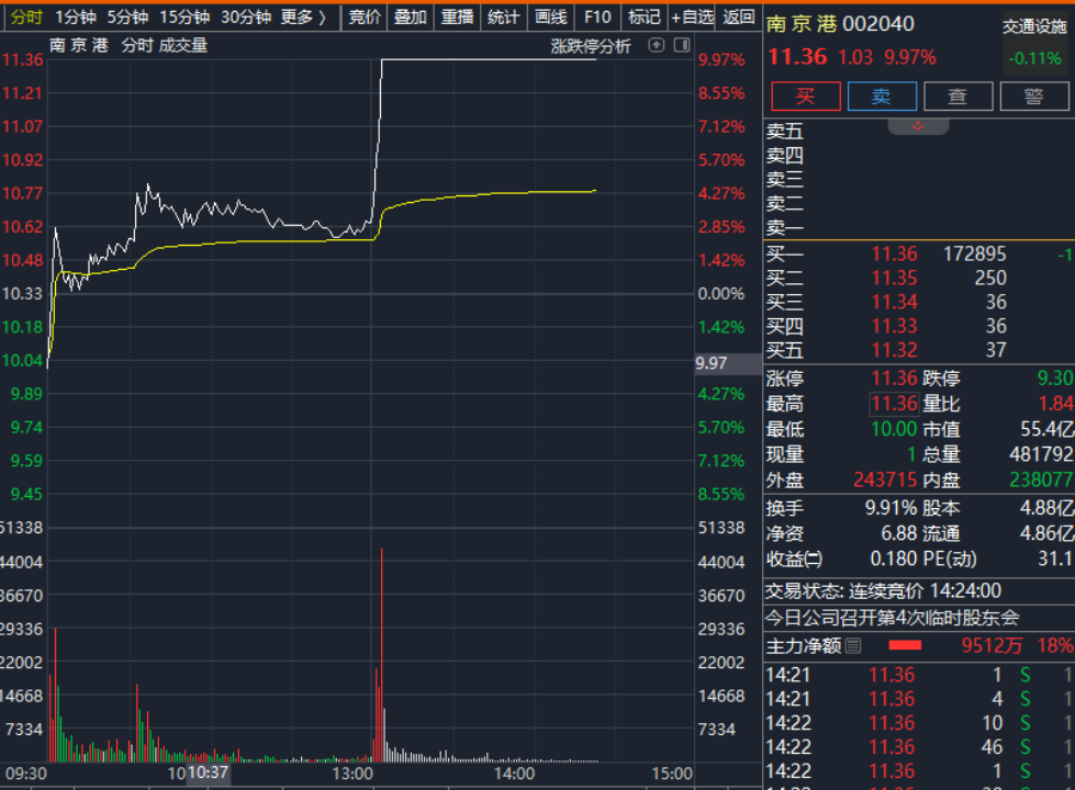 10月13日午后,南京港股价直线拉升,3分钟内就被资金封死涨停板;连云港也大幅拉升,涨幅一度接近8%,北部湾港、重庆港也纷纷跟涨;部分航运股也有拉升动作,国航远洋、宁波海运一度涨超6%,凤凰航运、华光源海等跟涨。航运板块集体走强,反映出市场对政策利好的积极反应。