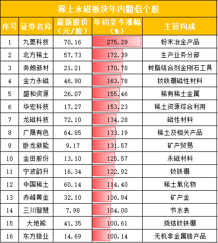 从板块表现来看,稀土永磁指数单日涨幅更是达到7.28%,截至今日收盘,稀土永磁指数今年以来(截至10月13日)涨超80%。不包含今年上市的新股,同期板块内16股股价翻倍,其中,九菱科技年内涨幅达到了275%。