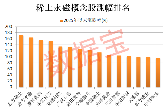 稀土永磁行业产业链涵盖上、中、下游三个核心环节,上游聚焦稀土资源的开采与初级加工;中游是稀土永磁材料的制备环节。下游则面向多元化应用领域,涵盖新能源汽车(驱动电机)、风电设备(发电机)、消费电子(手机振动马达)、工业电机、医疗设备及军工等。数据宝统计,在一系列利好刺激下,稀土永磁概念股二级市场走势不俗。截至10月13日收盘,今年以来稀土永磁概念股平均上涨76.35%,北方稀土、金力永磁、盛和资源、华宏科技、龙磁科技累计涨幅排在前五位。