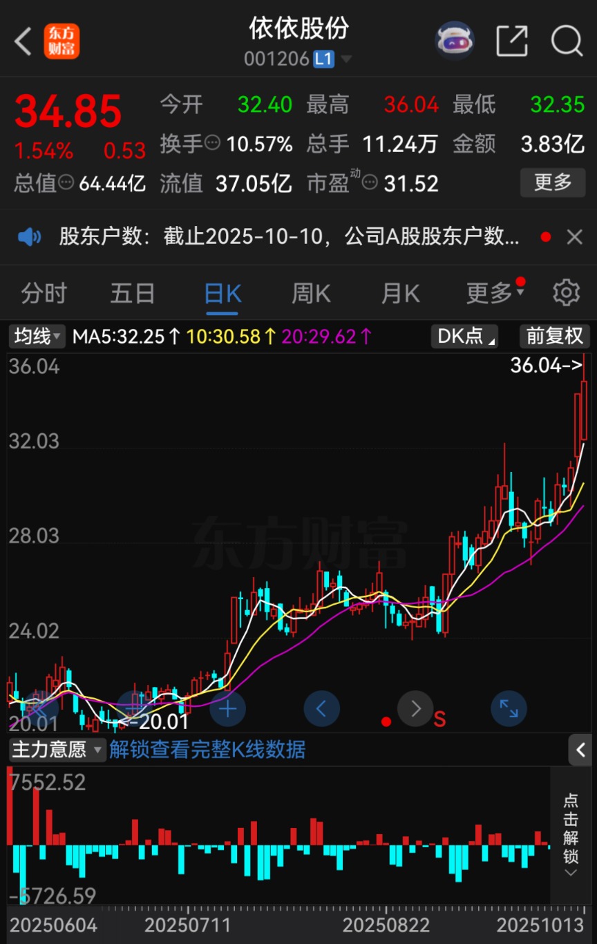 对此,依依股份计划自10月14日开市起停牌,预计在不超过10个交易日内披露交易方案。截至10月13日收盘,依依股份股价报34.85元/股,涨幅达1.54%,总市值为64.44亿元。