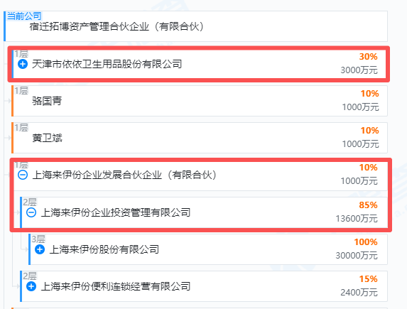 高爷家公司的第四大股东是宿迁拓博资产管理合伙企业(有限合伙)(以下简称宿迁拓博),持股比例为8.125%,后者的第一大股东是A股公司依依股份,第二大股东是A股公司来伊份的控股子公司。
