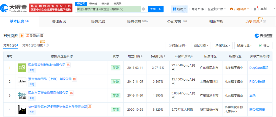 天眼查显示,宿迁拓博当前对外投资了4家企业,分别是深圳逗爱创新科技有限公司、高爷家公司、深圳市豆柴宠物用品有限公司、蛋壳宠物用品(上海)有限公司。
