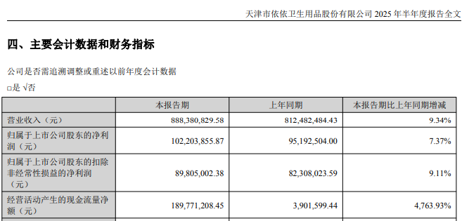 2025年上半年,依依股份营业收入同比增长9.34%至8.88亿元,归母净利润同比增长7.37%至1.02亿元,扣非后净利润同比增长9.11%至8980.50万元。