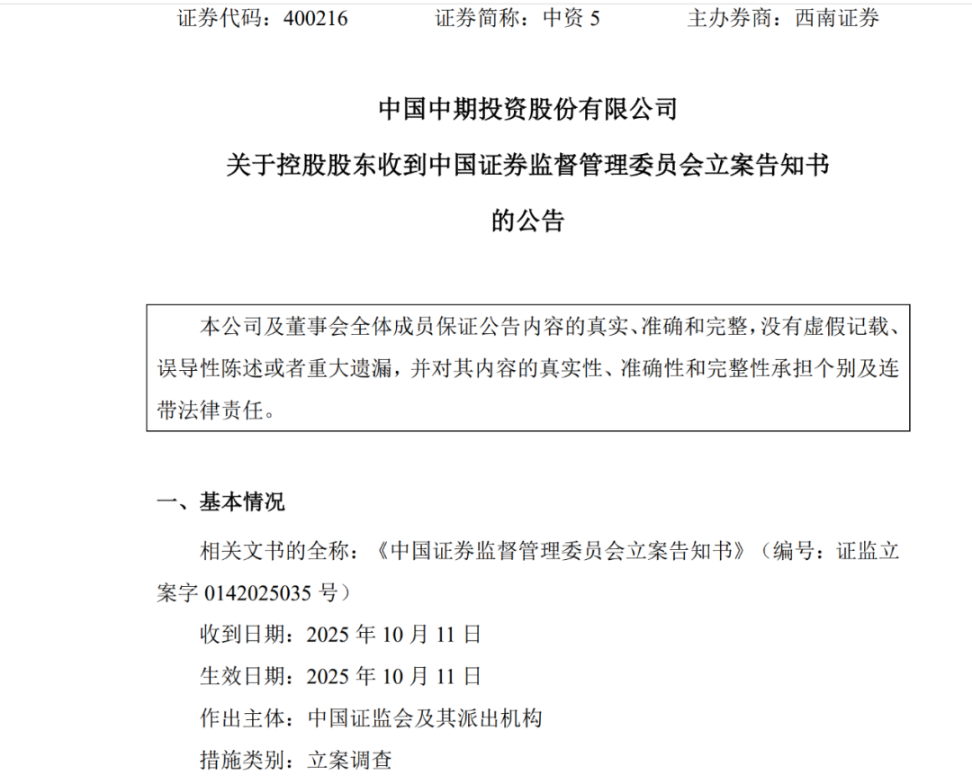 10月13日晚间,已退市1年多的中国中期投资股份有限公司(以下简称中国中期)公告称,控股股东中期集团有限公司于10月11日收到《中国证券监督管理委员会立案告知书》。