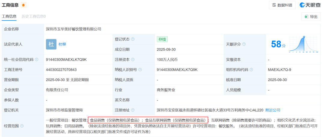 天眼查显示,深圳市玉华美好餐饮管理有限公司(下称玉华餐饮)于9月30日正式成立,注册资本达100万元人民币。从股权结构来看,玉华餐饮由内蒙古西贝餐饮集团有限公司持有95%的股权,深圳市本康美好餐饮管理合伙企业(有限合伙)持有5%的股权,显示出西贝在该公司的主导地位。