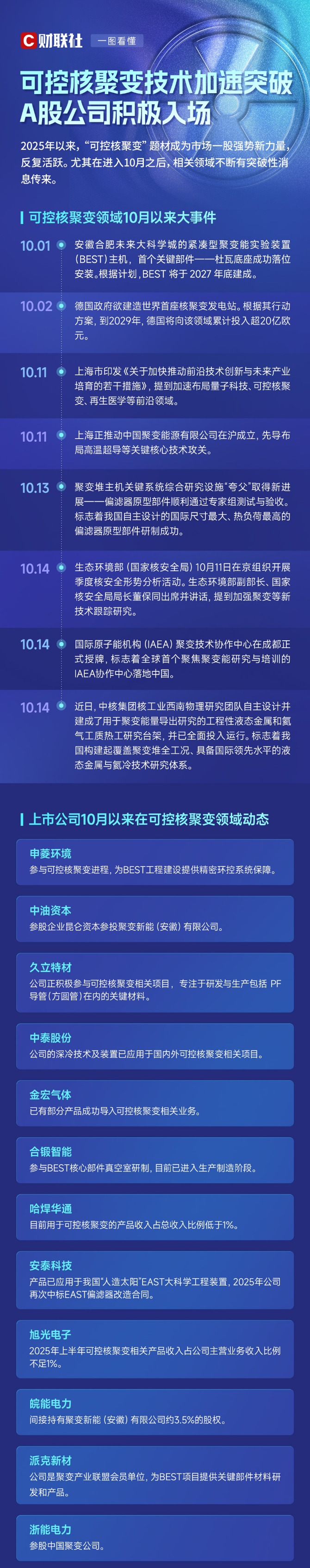 ①2025年以来,“可控核聚变”题材在A股市场中表现强劲,成为投资新热点,吸引了众多投资者的目光。②进入10月后,该领域不断有突破性消息传出,进一步推动其市场活跃度,相关概念股股价也随之水涨船高。