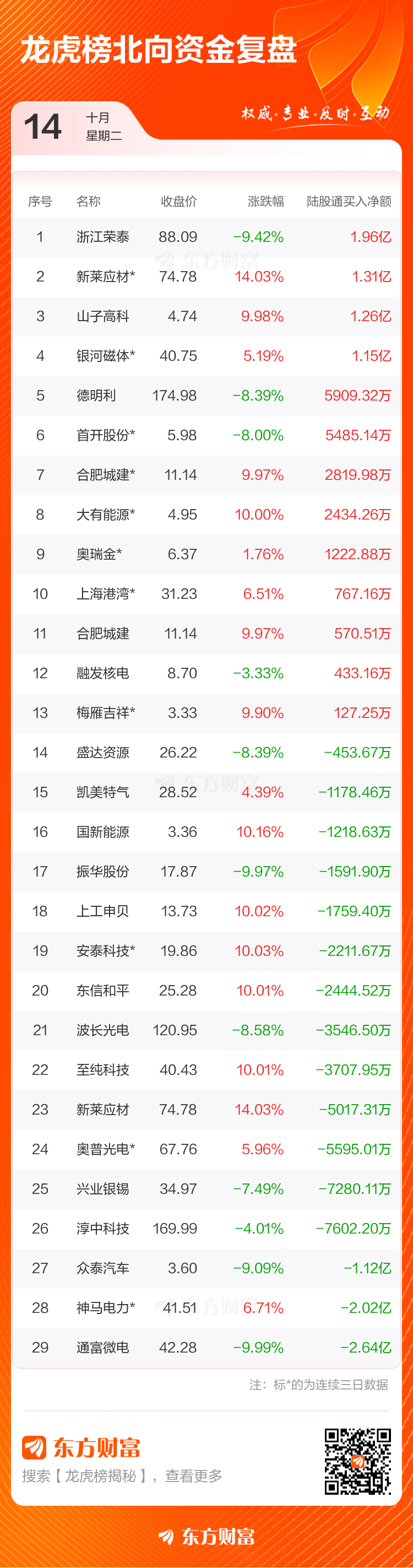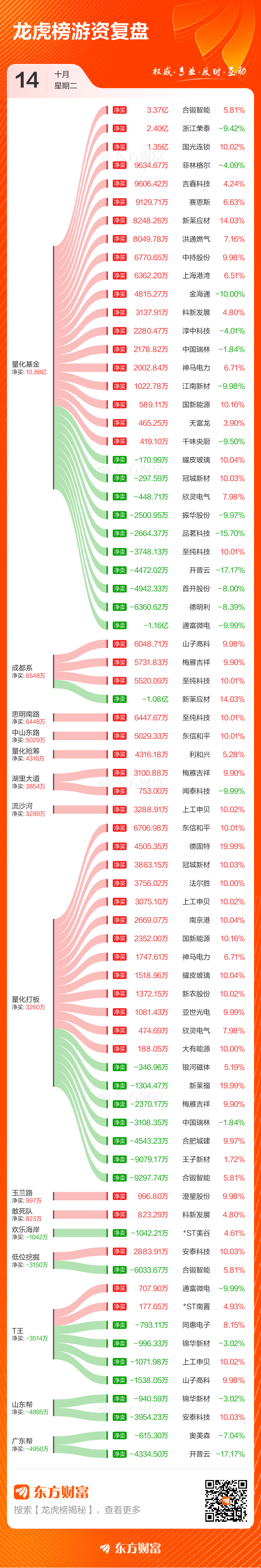 10月14日龙虎榜揭晓:70只个股上榜,山子高科净买入额居首