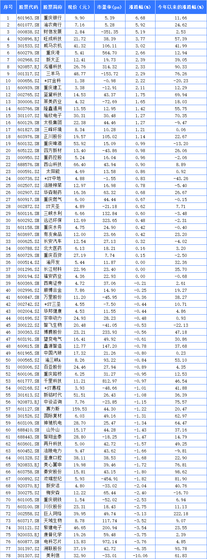 10月14日重庆A股动态:35家上涨,美利信跌幅显著