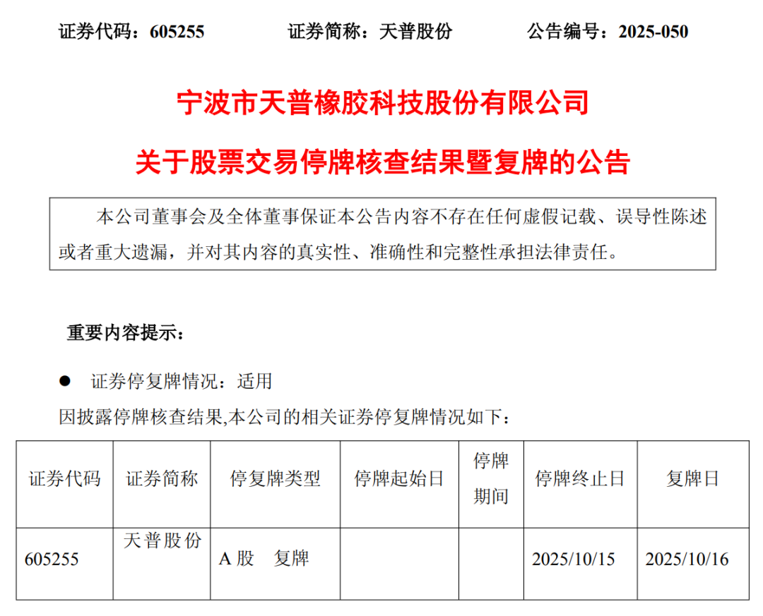 很多投资者预期的AI芯片公司中昊芯英通过天普股份登陆A股的想法,或将彻底落空,这一转折引发市场广泛关注。10月15日晚,连续15个交易日涨停、区间涨幅达317.72%的天普股份公告,根据相关规定,经向上海证券交易所申请,公司股票将于2025年10月16日(星期四)开市起复牌。