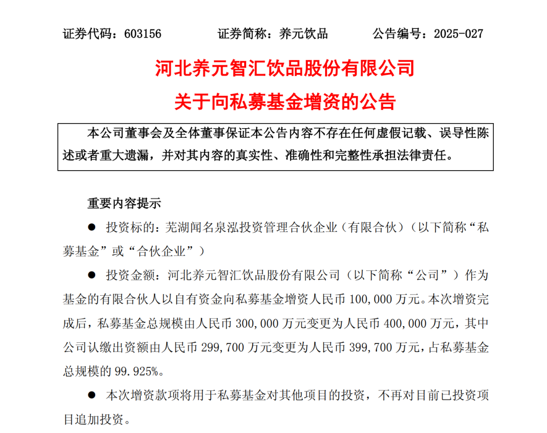 【导读】养元饮品对旗下私募基金增资10亿元,投资布局引关注