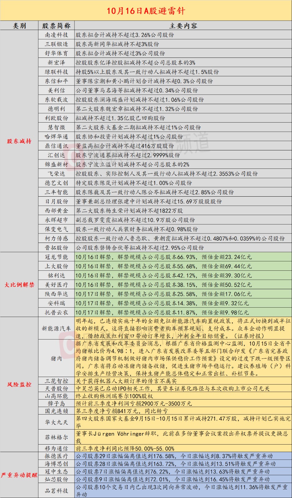 导读:近日,A股及海外市场潜在风险事件频发,涉及新能源汽车购置税政策调整、猪粮比价预警、公司减持潮及美股市场波动等。国内经济信息方面,新能源汽车购置税政策明年退坡,广东省猪粮比价进入过度下跌一级预警区间;公司方面,多家企业发布减持公告,三花智控澄清机器人订单传言;海外市场,美股三大指数收盘涨跌不一,稀土概念跌幅居前,全球公共债务占GDP比重将创新高。新能源汽车政策与猪粮比价预警成为市场关注焦点。