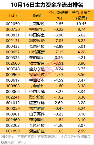 19股主力资金净流出超3亿元,三花智控、宁德时代、中国稀土、利欧股份、蓝思科技、中钨高新、美的集团等净流出金额均超4亿元,资金流出压力较大。