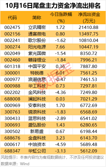 净流出方面,立讯精密、通富微电、歌尔股份、阳光电源尾盘主力资金净流出均超1亿元。