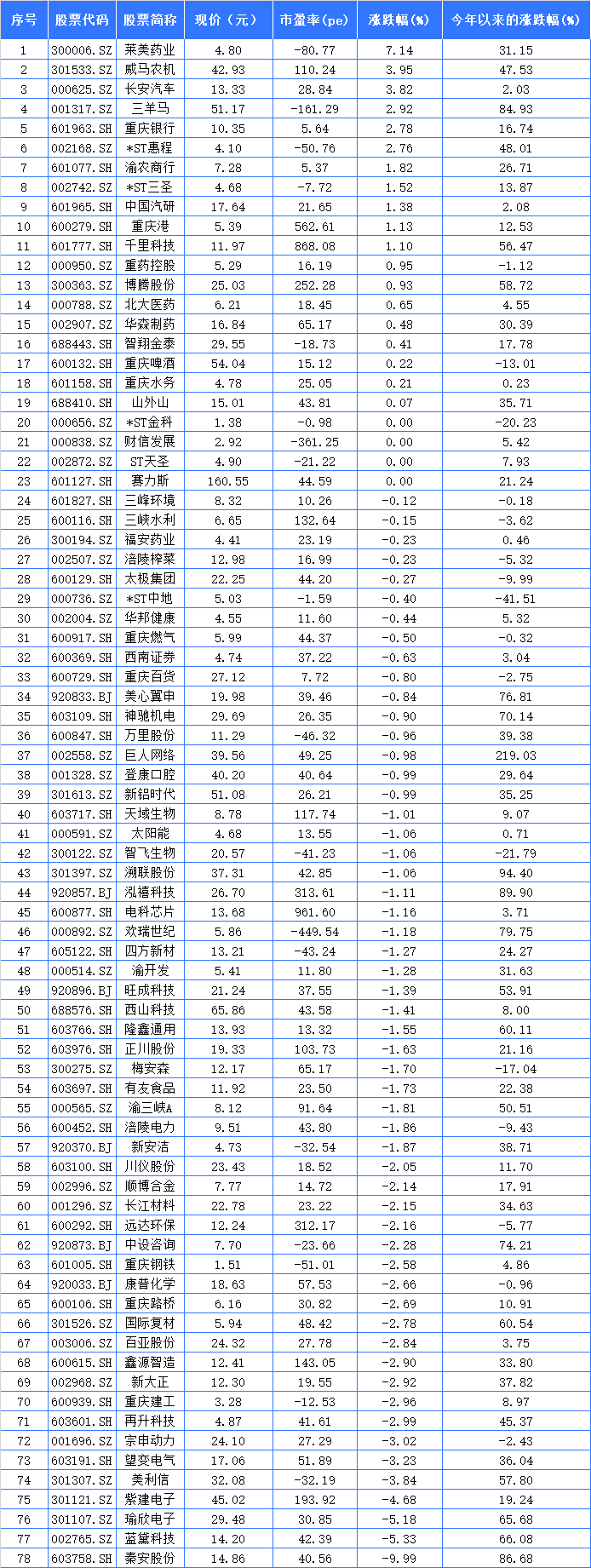当日,渝股有4家平收,为*ST金科、财信发展、ST天圣、赛力斯。下跌渝股中,秦安股份、蓝黛科技和瑜欣电子分别以-9.99%、-5.33%和-5.18%,列涨幅最后三位。秦安股份报收14.86元,日涨幅-9.99%(跌停),换手率5.71%,不过,今年以来的涨幅为86.68%。蓝黛科技报收14.20元,日涨幅-5.33%,换手率10.27%,今年以来的涨幅为66.08%。瑜欣电子报收29.48元,日涨幅-5.18%,换手率8.00%,今年以来的涨幅为65.68%。整体来看,10月16日重庆A股市场涨跌互现,部分个股表现亮眼,而部分个股则跌幅较大,投资者需密切关注市场动态。