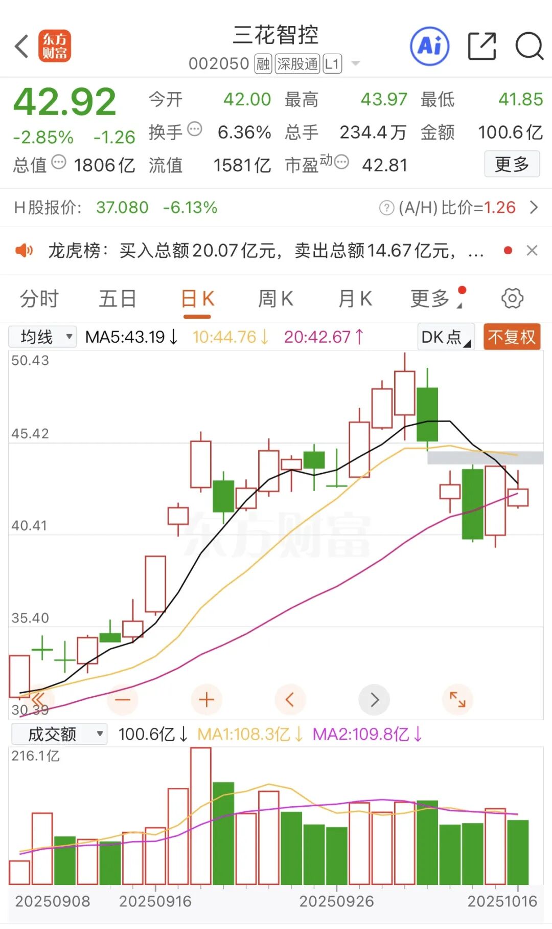 10月16日,三花智控A股收跌2.85%,报42.92元/股;港股收跌6.13%,报37.08港元/股,股票市场波动引发关注。