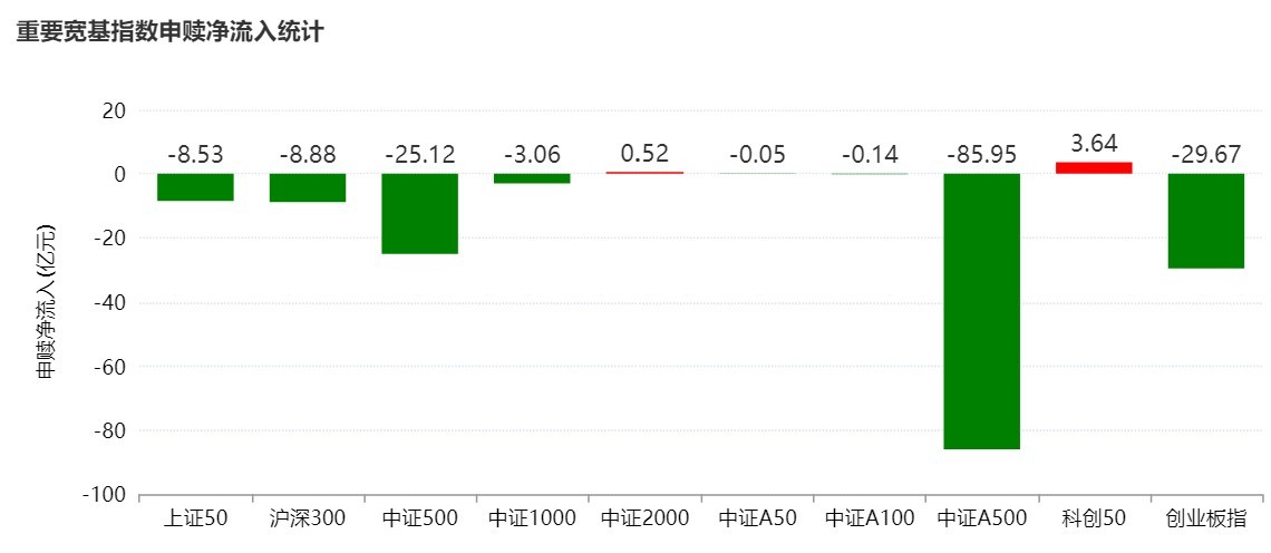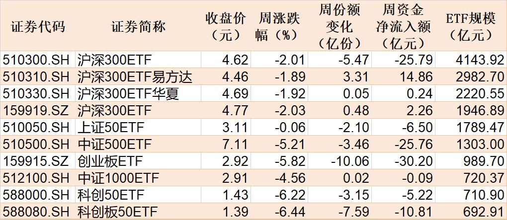 细分来看,主要宽基指数整体资金申赎统计显示,本周科创50净流入3.64亿元,中证A500净流出85.95亿元。具体ETF方面,规模较大的10只宽基指数ETF本周合计净流出87.01亿元,其中沪深300ETF、中证500ETF、创业板ETF净流出均超25亿元,显示资金对核心指数的短期谨慎态度。