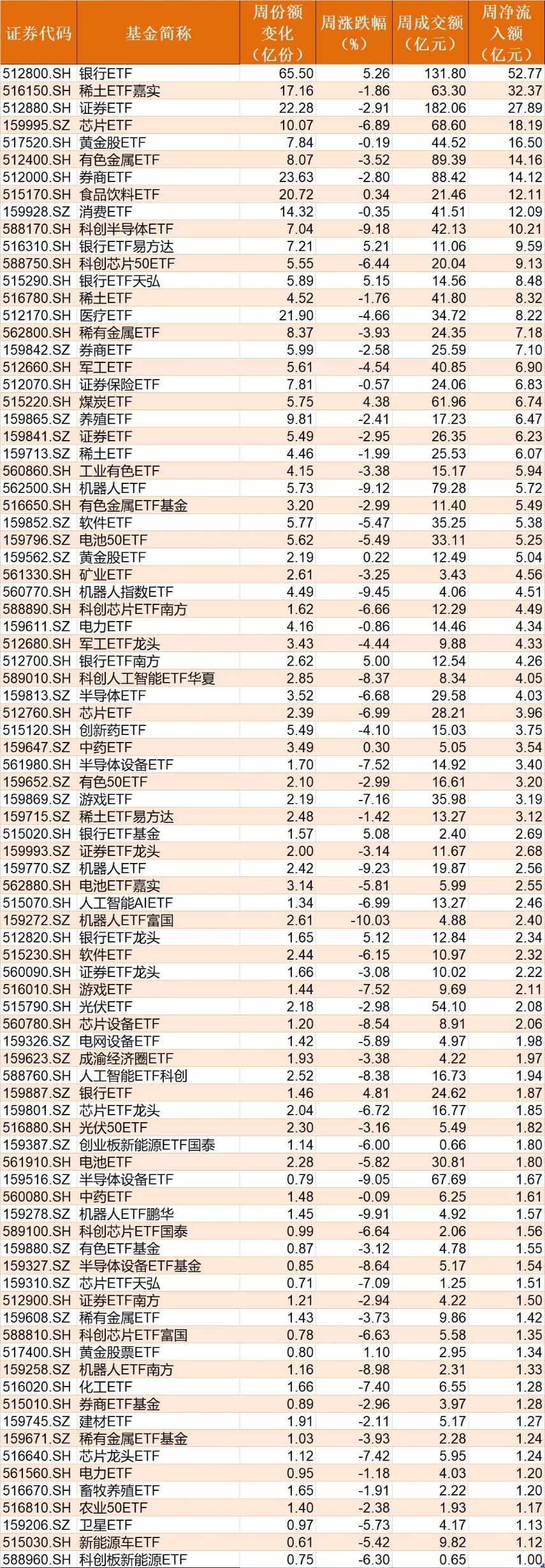 值得注意的是,本周银行板块再度获得资金关注,银行ETF(512800)份额增加了65.5亿份,升至253.29亿份,创上市新高。有分析认为,全球资产价格波动近期加剧,催生投资者防御性配置需求,银行板块受外部冲击影响相对可控,或迎来配置机会。同时,银行板块分红稳定,经回调后股息率性价比回升,红利价值有望吸引避险资金流入。