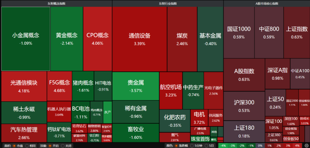 昨日A股三大指数集体上涨,沪指涨0.63%,深证成指涨0.98%,创业板指涨1.98%,沪深两市成交额超过1.7万亿,较上一交易日缩量约2000亿。行业板块呈现普涨态势,煤炭行业、燃气、非金属材料、电机、航空机场、通信服务、电池、通信设备、消费电子板块涨幅居前,贵金属板块逆市重挫。