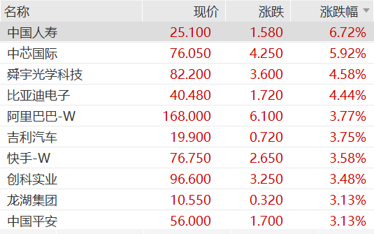 香港恒指涨近2%,恒生科技指数持续走强涨超3%。科网股表现强势,汽车股盘中冲高,哔哩哔哩涨超10%,中芯国际涨超6%,比亚迪电子涨约5%,小鹏汽车、快手涨超4%,阿里巴巴涨超3.7%,港股市场同样表现不俗。
