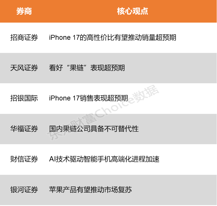 招商证券表示,苹果3年硬件创新加速周期开始,且其在端侧AI软件和生态的创新在明年值得重视,苹果创新周期开启,建议把握低估的果链。天风证券指出,iPhone17系列领衔多款新品亮相,芯片、散热、传感器全面升级,看好“果链”表现超预期。