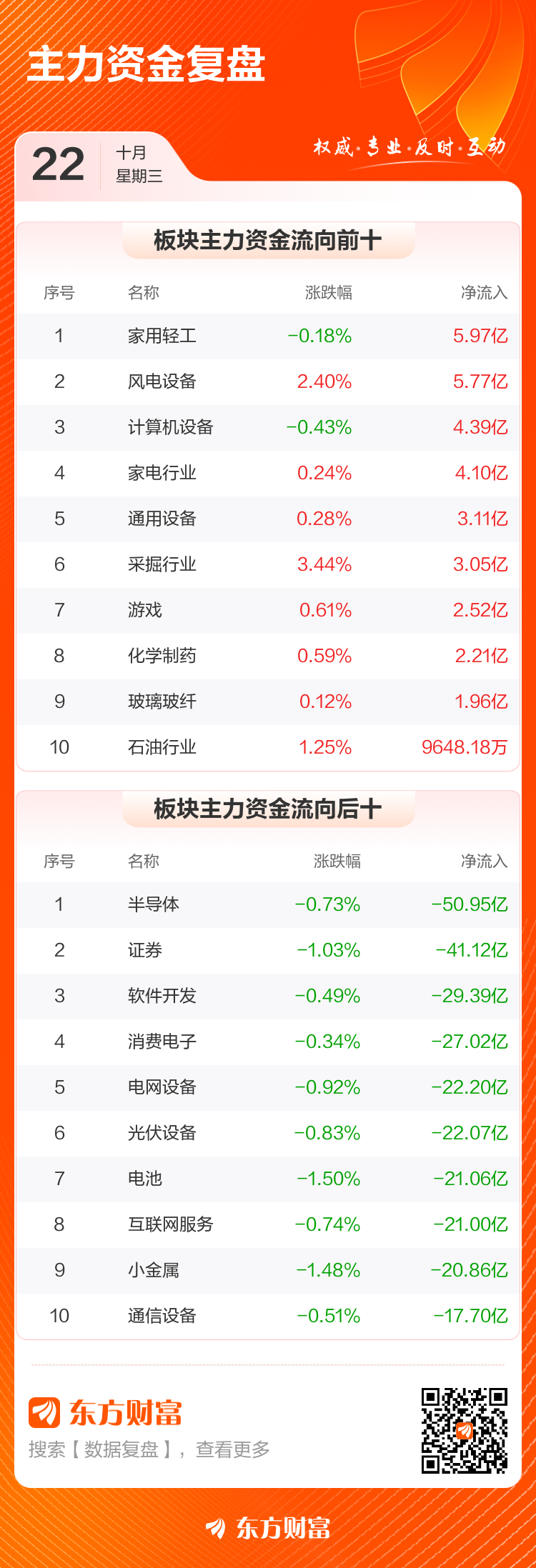 10月22日A股市场震荡:沪指微跌,主力资金流向分化