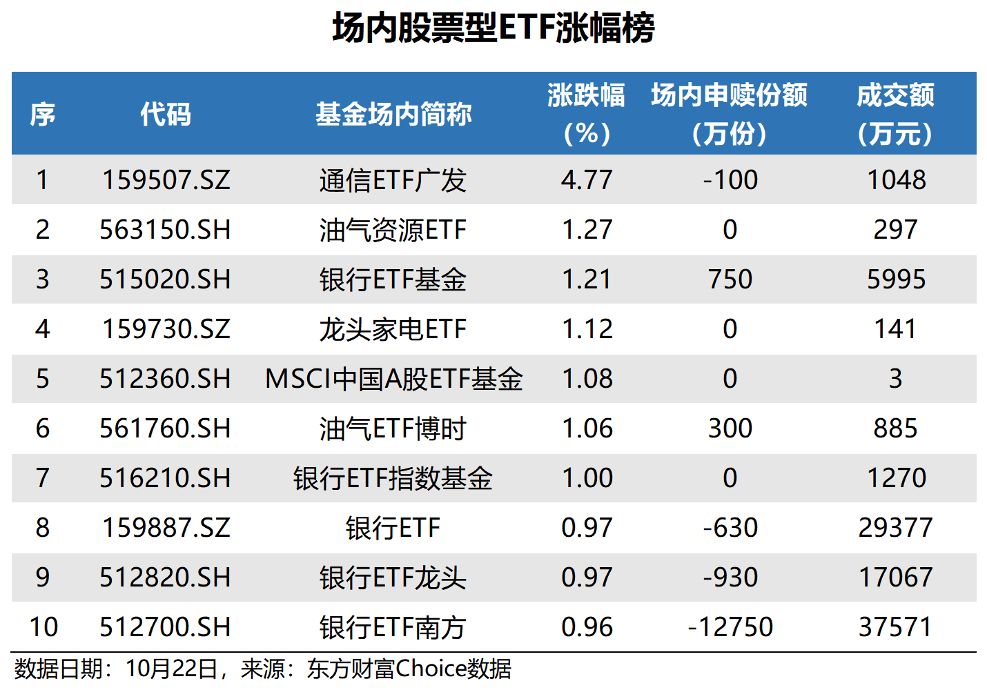 数据显示,昨日场内股票型ETF中,通信ETF广发、油气资源ETF、银行ETF基金涨幅居前。其中,通信ETF广发涨幅最大,为4.77%,成为当日ETF市场的亮点。