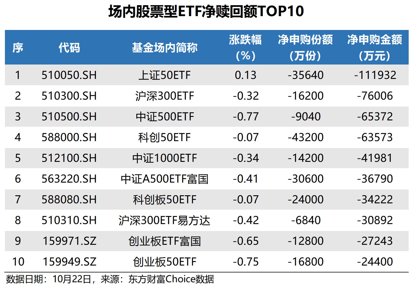 数据还显示,昨日净赎回金额最多的场内股票型ETF为上证50ETF,净赎回金额11.19亿元;沪深300ETF紧随其后,净赎回金额7.60亿元,指数ETF赎回压力显现。