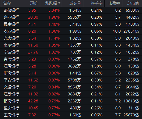 银行板块走高,农业银行继续走强,现涨超1%,该股自9月25日以来走出15连阳,累计涨幅近25%,总市值逼近2.8万亿元。此外,邮储银行涨超3%,兴业银行、民生银行、光大银行等跟涨。摩根士丹利认为,第四季度即将到来的股息派发、利率企稳、5000亿元人民币结构性金融政策工具,以及更可持续的政策路径,都将支撑中国银行业股票重估。投资者应将关注点转向那些在“自然出清”环境中盈利更早、强劲反弹的优质银行。