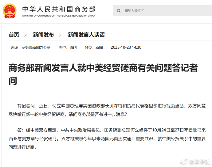 答:经中美双方商定,中共中央政治局委员、国务院副总理何立峰将于10月24日至27日率团赴马来西亚与美方举行经贸磋商。双方将按照今年以来两国元首历次通话重要共识,就中美经贸关系中的重要问题进行磋商,中美经贸磋商成为市场关注焦点。
