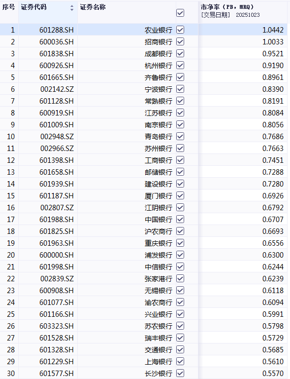 而除市值外,农业银行的估值指标也发生了积极变化。10月17日盘中,农业银行A股市净率时隔7年多再次站上1倍关口,打破了国有银行长期“破净”(即市净率低于1倍)的局面。截至10月23日收盘,农业银行市净率为1.04倍,超过招商银行,是42家A股上市银行中仅有的两家市净率超过1倍的银行之一。
