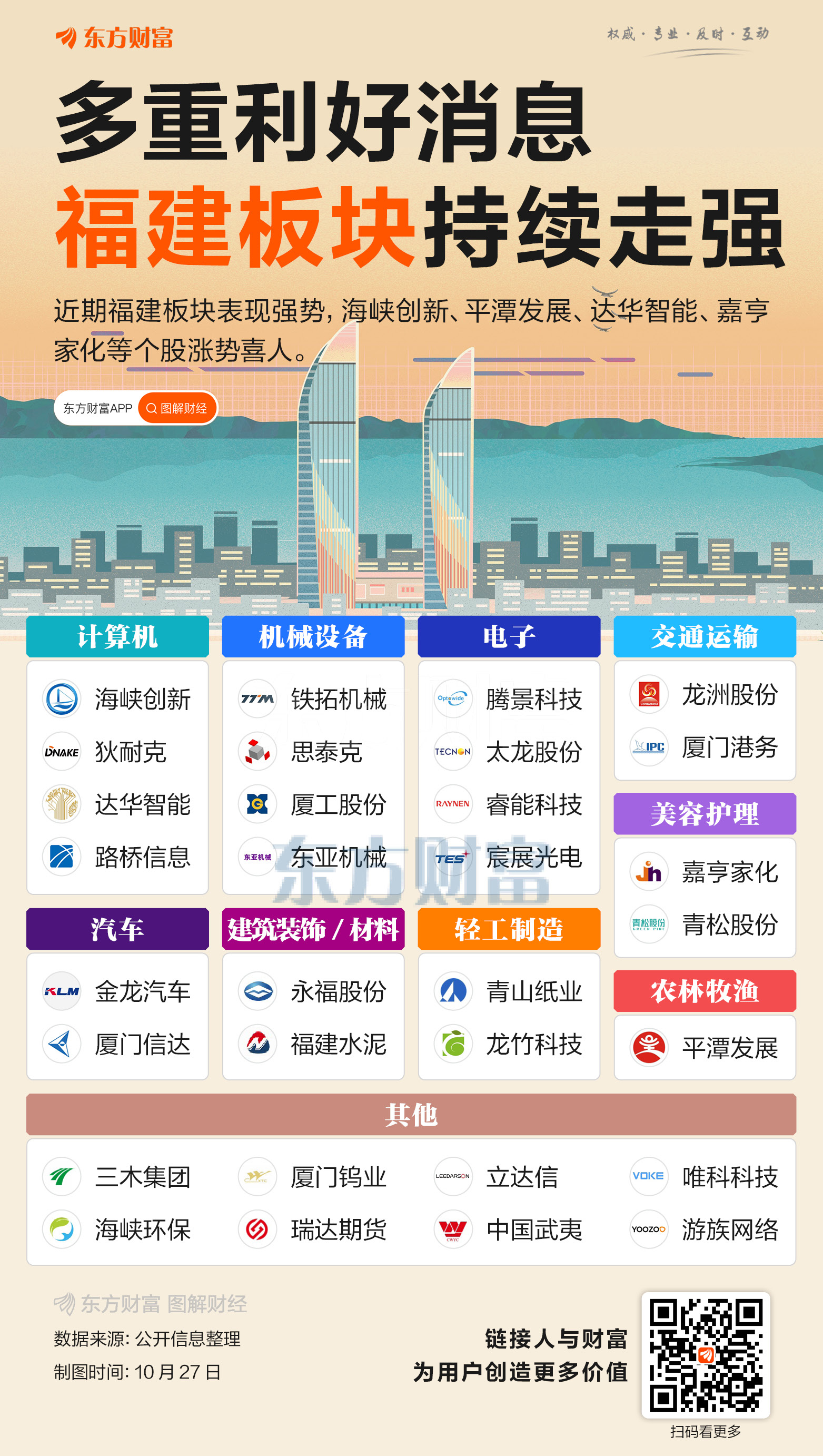 福建板块成为近期强势的地区板块之一,板块指数最新为6连阳,10月27日盘中指数还创出历史新高,福建板块发展势头强劲。个股而言,嘉亨家化、达华智能、路桥信息、平潭发展、海峡创新表现强势,指数6连阳期间累计涨幅均超过30%,其中平潭发展、达华智能最新录得三连板行情。