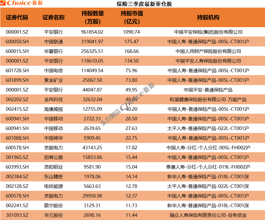 保险公司持股方面,在已公布2025年三季报的上市公司中,中国平安(集团)持有平安银行96.19亿股,持股市值1090.74亿元;中国人寿旗下保险产品持有中国联通31.9亿股,持股市值175.47亿元。紫金矿业、海康威视等被保险持有市值均超40亿元,显示出保险公司对大盘蓝筹股的青睐。
