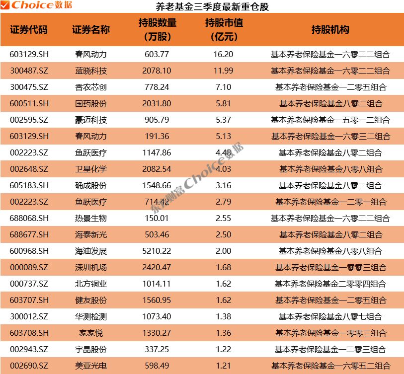 在已公布2025年三季报的上市公司中,养老基金(关键词4)持股市值最高的个股是春风动力,养老金一六零二二组合、一六零三二组合分别持有603.77万股、191.36万股,持股市值16.20亿元、5.13亿元。此外,一二零五组合持有香农芯创7.1亿元,体现了养老基金对成长股的配置。