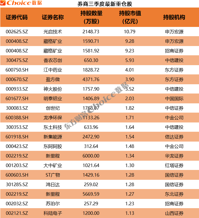 在已公布2025年三季报的上市公司中,申万宏源、招商证券分别持有藏格矿业1590.71万股、1581.92万股,持股市值9.28亿元、9.23亿元。中信建投、东方证券分别持有香农芯创、江中药业5.93亿元、4.01亿元,券商的持股动向也反映了其对市场的判断。
