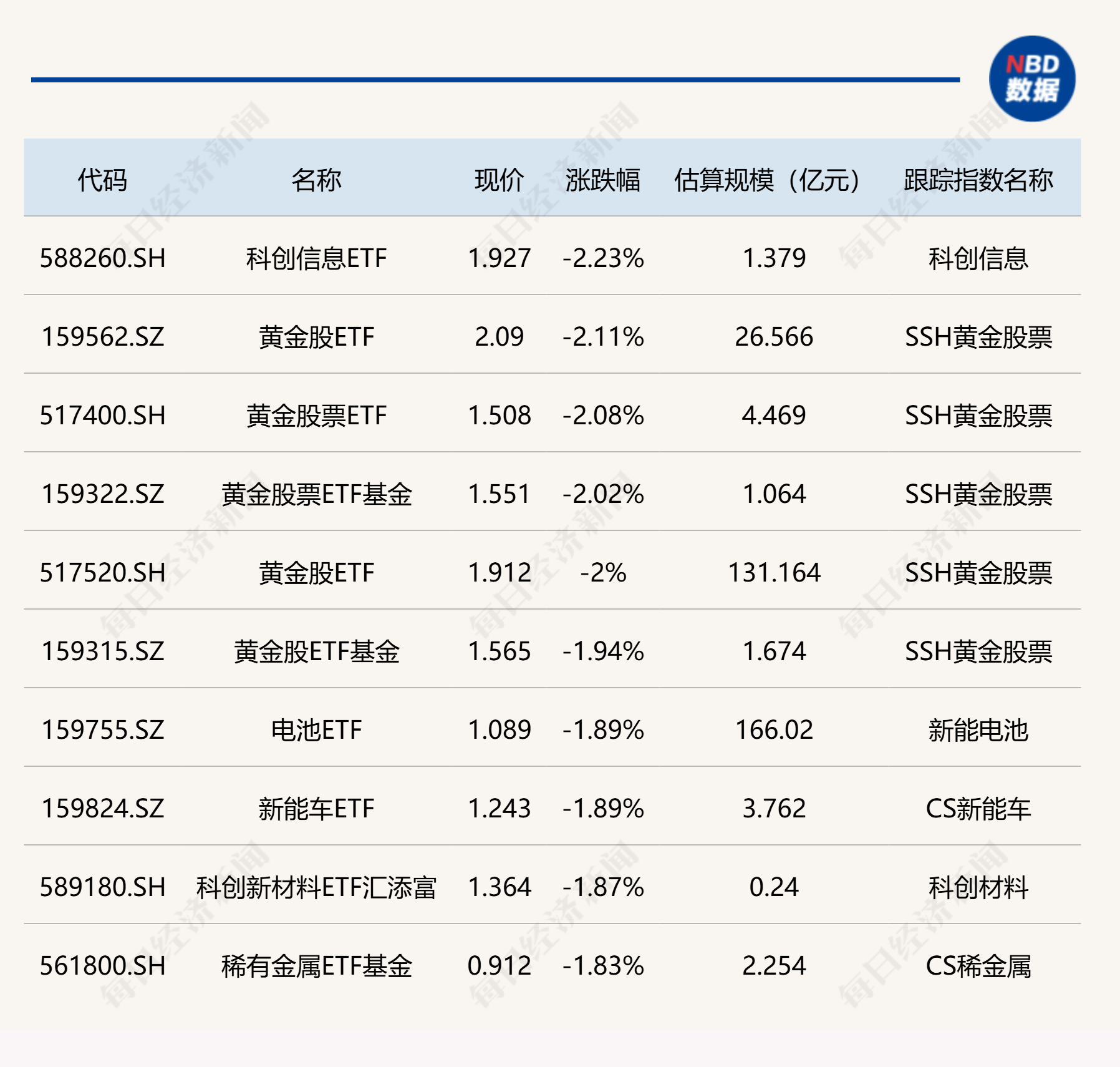 下跌方面,科创信息、黄金股相关ETF跌超2%。有分析认为,近期黄金因贸易紧张关系有缓和迹象而小幅回调,这会削弱该贵金属的避险吸引力。此外,黄金在快速上涨后累计了一定盈利仓位,注意可能的调整和波动加剧,投资者需谨慎对待。