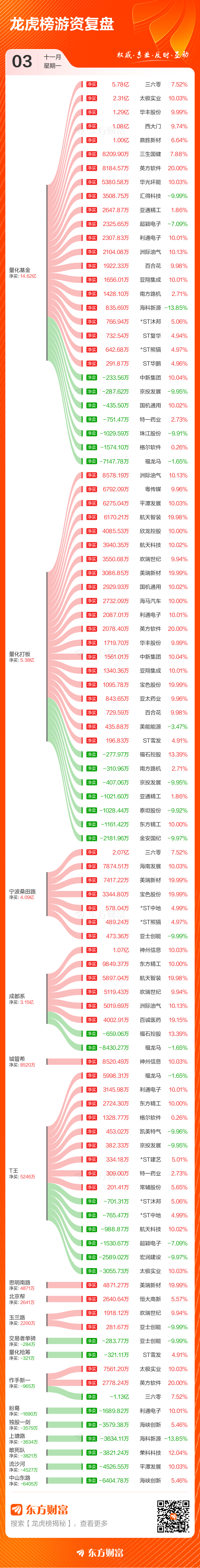 11月3日股市动态备受关注,当日共有71只个股(含1只可转债)荣登龙虎榜,总上榜成交额高达145.05亿元,这一数据彰显了股市的活跃程度。在众多上榜个股中,三六零表现抢眼,其净买入额独占鳌头,金额为6.64亿元,成为当日股市的一大亮点。
