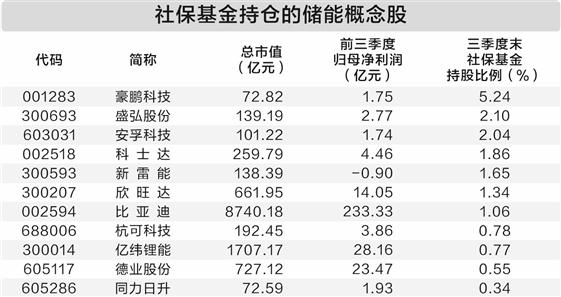 从业绩表现来看,前三季度宁德时代、比亚迪、阳光电源、亿纬锂能、国轩高科等10股的净利润规模居前。宁德时代前三季度营收为2830.72亿元,同比增长9.28%;净利润为490.34亿元,同比增长36.2%;第三季度公司动力、储能合计出货量接近180GWh,其中储能占比约20%。从业绩增长幅度来看,科陆电子前三季度成功扭亏,杉杉股份、固德威、科力远、国轩高科、豪鹏科技前三季度净利润同比翻倍。杉杉股份的业绩增幅最高,公司前三季度营业总收入148.09亿元,同比增长11.48%,归母净利润2.84亿元,同比增长1121.72%。截至三季度末,11只储能概念股获得社保基金持仓,豪鹏科技、盛弘股份、安孚科技、科士达等持股比例居前。