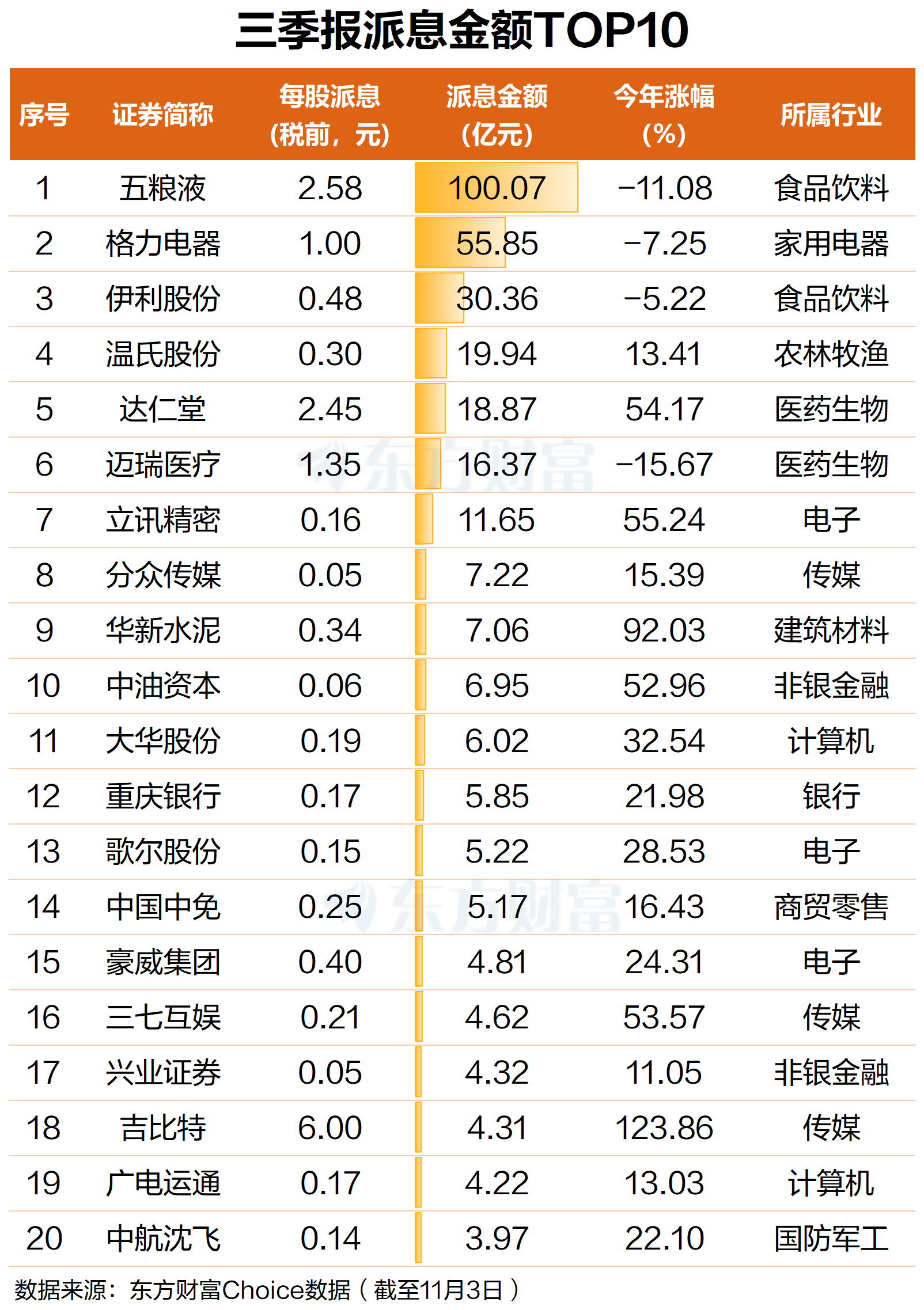 五粮液、格力电器、伊利股份和温氏股份这4家行业龙头,三季报派息金额合计206.22亿元,占全市场三季报分红总额的44%。除上述公司外,医药生物行业的达仁堂和迈瑞医疗,以及电子行业龙头立讯精密,派现金额均超10亿元,龙头效应持续显现。