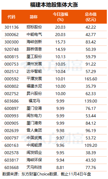 福建板块早盘单边上行,平潭发展收获近9个交易日内的第8个涨停板,漳州发展、厦门空港、中国武夷等多股涨停,海峡创新涨超15%。值得注意的是,昨日晚间,平潭发展再次发布股价异动公告称,公司主要业务为造林营林、林木产品加工与销售、贸易业务、与平潭综合实验区开放开发的有关业务,目前公司的生产经营正常,经营情况及内外部经营环境未发生重大变化。