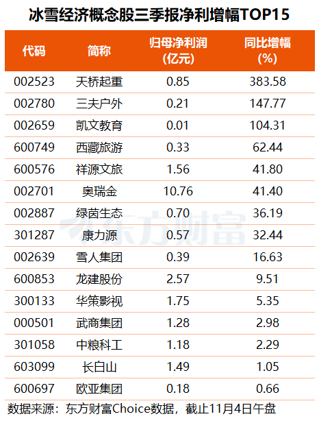 就三季报业绩来看,部分冰雪经济概念股业绩增长明显,其中天桥起重前三季度归母净利润同比大增近四倍,三夫户外、凯文教育净利增幅均超100%。国盛证券研报称,2025年第四季度,冰雪旅游热度已升温。美团旅行数据显示,10月中旬以来,“室外滑雪场”搜索量同比上涨近900%,开板较早的可可托海国际滑雪度假区搜索量上涨279%,哈尔滨冰雪大世界景区日均搜索量环比上涨近163%。