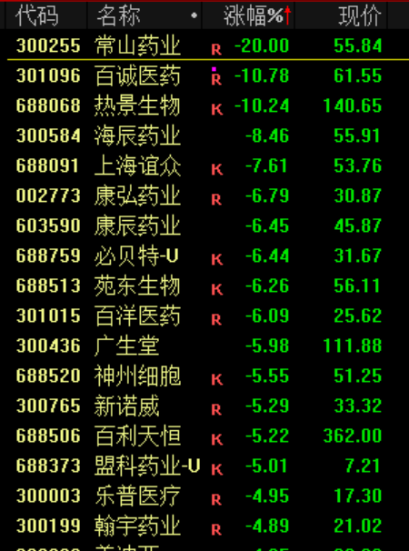 下跌方面,创新药概念股下挫,常山药业跌停。