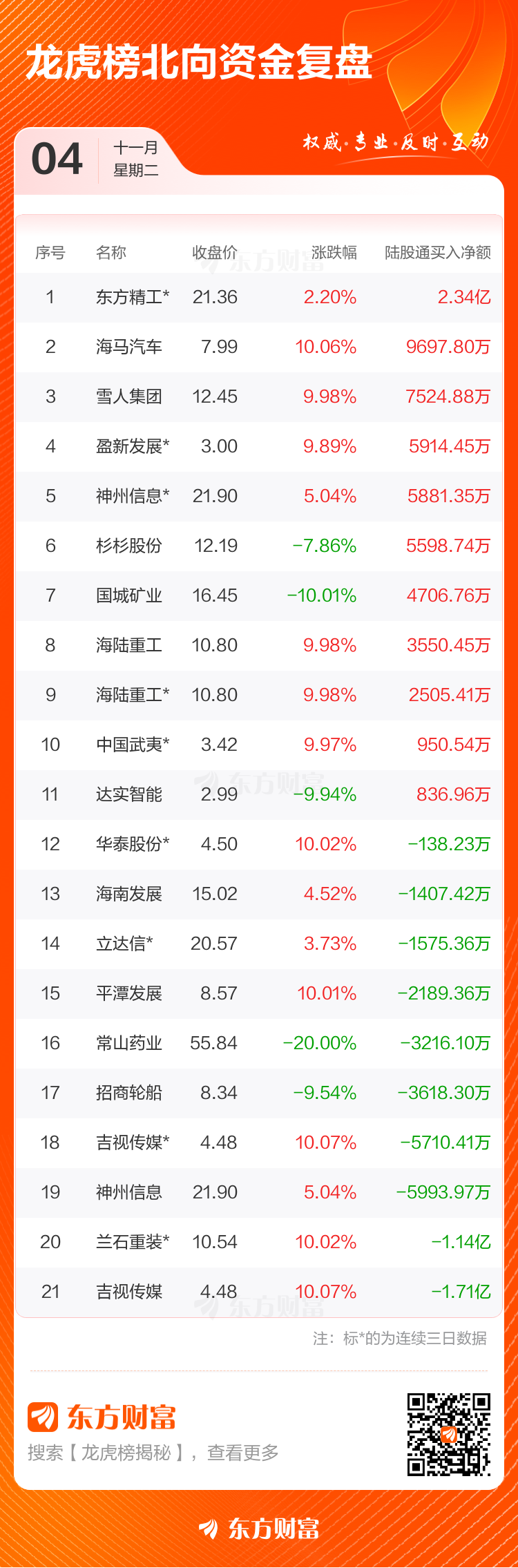 11月4日龙虎榜揭晓:64只个股上榜,东方精工净买入额居首