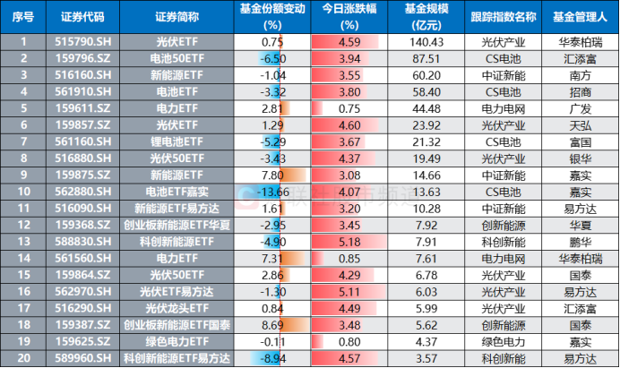 注:基金规模居前的电力设备系ETF近3日份额变动情况(基金份额、规模截至11月4日,其余数据截至11月5日)