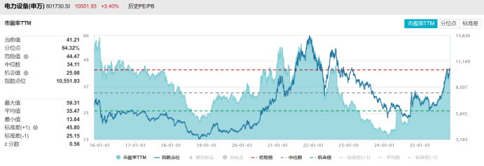 此外,从估值层面来看,电力设备板块指数(申万一级)目前市盈率达41.21倍,处于近十年64.32%分位点;市净率达3.41倍,处于近十年64.22%分位点。若以整个市场统计,电力设备板块指数目前市盈率分位点在31个申万一级板块中位列第6位,仅次于商贸零售、房地产、计算机、电子、汽车板块,并较去年年末时(第13位)共提升7个位次,电力设备板块估值情况。