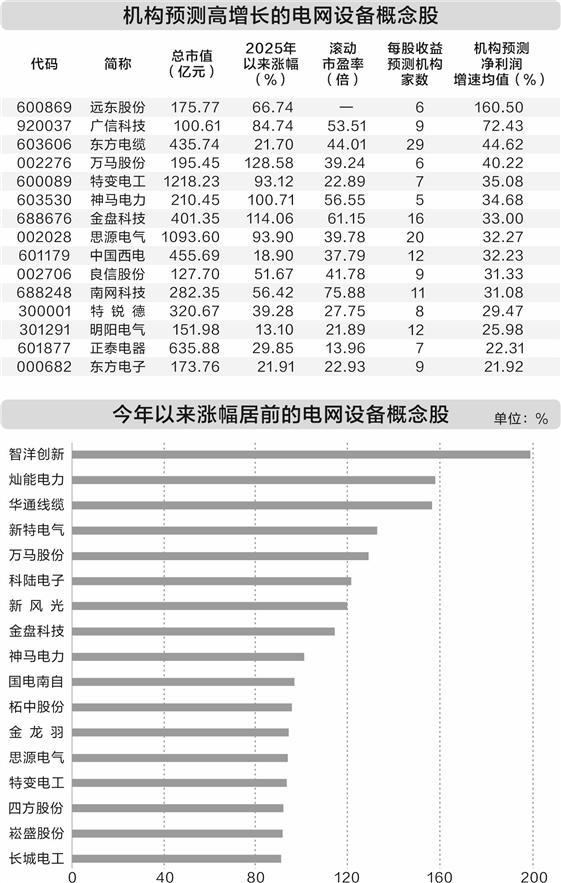 据证券时报·数据宝统计,今年以来,电网设备概念股平均上涨42.9%,年内涨幅翻倍的概念股有9只。具体来看,智洋创新、灿能电力、华通线缆、新特电气和万马股份涨幅排在前五位,概念股表现活跃。