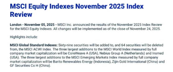 北京时间11月6日早间,国际指数编制公司MSCI公布了11月指数审核变更结果,这一MSCI指数调整引发市场关注。在本次调整中,MSCI中国A股指数新纳入17只标的,剔除16只。本次调整结果将于2025年11月24日收盘后生效。此次调整不仅涉及A股,港股市场也有多只股票被纳入或剔除,对相关板块影响显著。