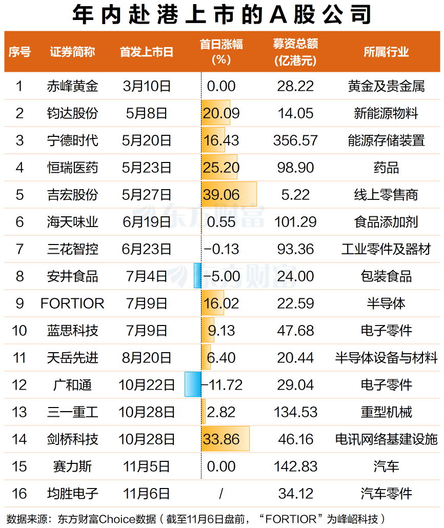 据东方财富Choice数据,截至11月6日,有86只新股在香港联交所上市,其中“A+H”股共计16只,占比18.6%。从上市首日的股价表现看,其中9只股票首日收涨,占比过半,涨幅最大的是吉宏股份,首日涨39.06%;2股首日收平,为赤峰黄金和赛力斯。上市首日股价收跌的“A+H”股共计3只,为三花智控、安井食品以及广和通,首日分别下跌0.13%、5.00%、11.72%。此外,11月6日上市的均胜电子,截至早间发稿下跌4.91%,有概率成为年内第4只首日破发的“A+H”股,这也为市场带来了新的思考。